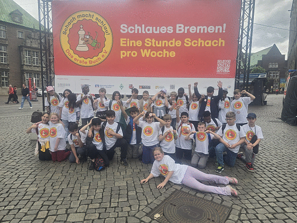 Am 05.06.2025 durften wir wieder am Schach-macht-Spaß-Turnier auf dem Bremer Marktplatz teilnehmen. Mit etwa 40 Schüler:innen wurde die Reise auf sich genommen. Die Viertkkässler der Schach-AG konnten dort zeigen, was sie die letzten zwei Jahre bei ihrer Schachlehrerin gelernt haben. Einige konnten das Schäfermatt erfolgreich anwenden und so schnell viele Punkte für das Team gewinnen. Der krönende Abschluss war, dass unser Team im Gewinnerteam war und so einen schönen Erfolg mit nach Hause nehmen durften. Wir freuen uns schon auf das nächste Jahr!
