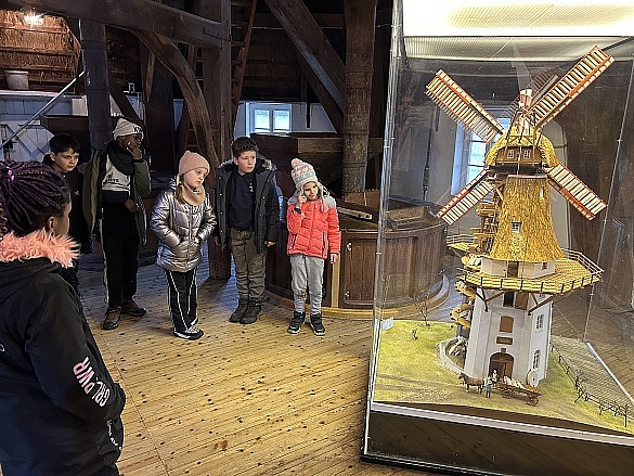 Anschließend führte das Mühlenteam die Klasse durch die historische Mühle. Die Kinder erfuhren, wie aus Getreide Mehl entsteht und welche Arbeitsschritte dafür notwendig sind – vom Mahlen über das Sieben bis hin zum fertigen Produkt. Besonders beeindruckend waren die großen Mahlsteine und die Geräusche der Mühle.